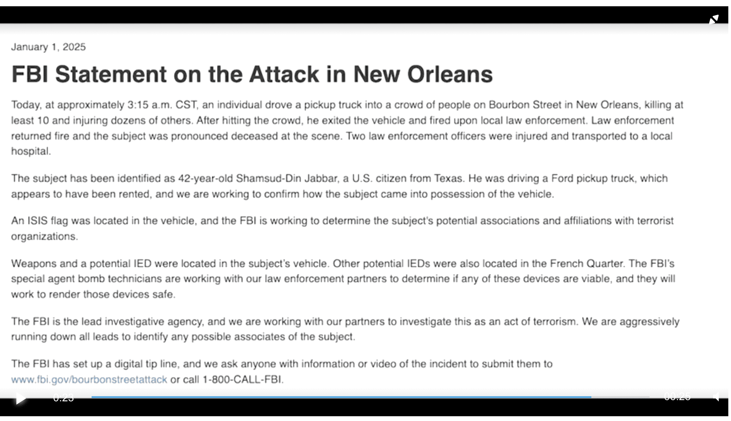 1月1日,負責事件調查的FBI確認,肇事男子已死亡,他來自德克薩斯州,是美國公民,名叫沙姆蘇德-丁‧賈巴爾(Shamsud-Din Jabbar),現年42歲。