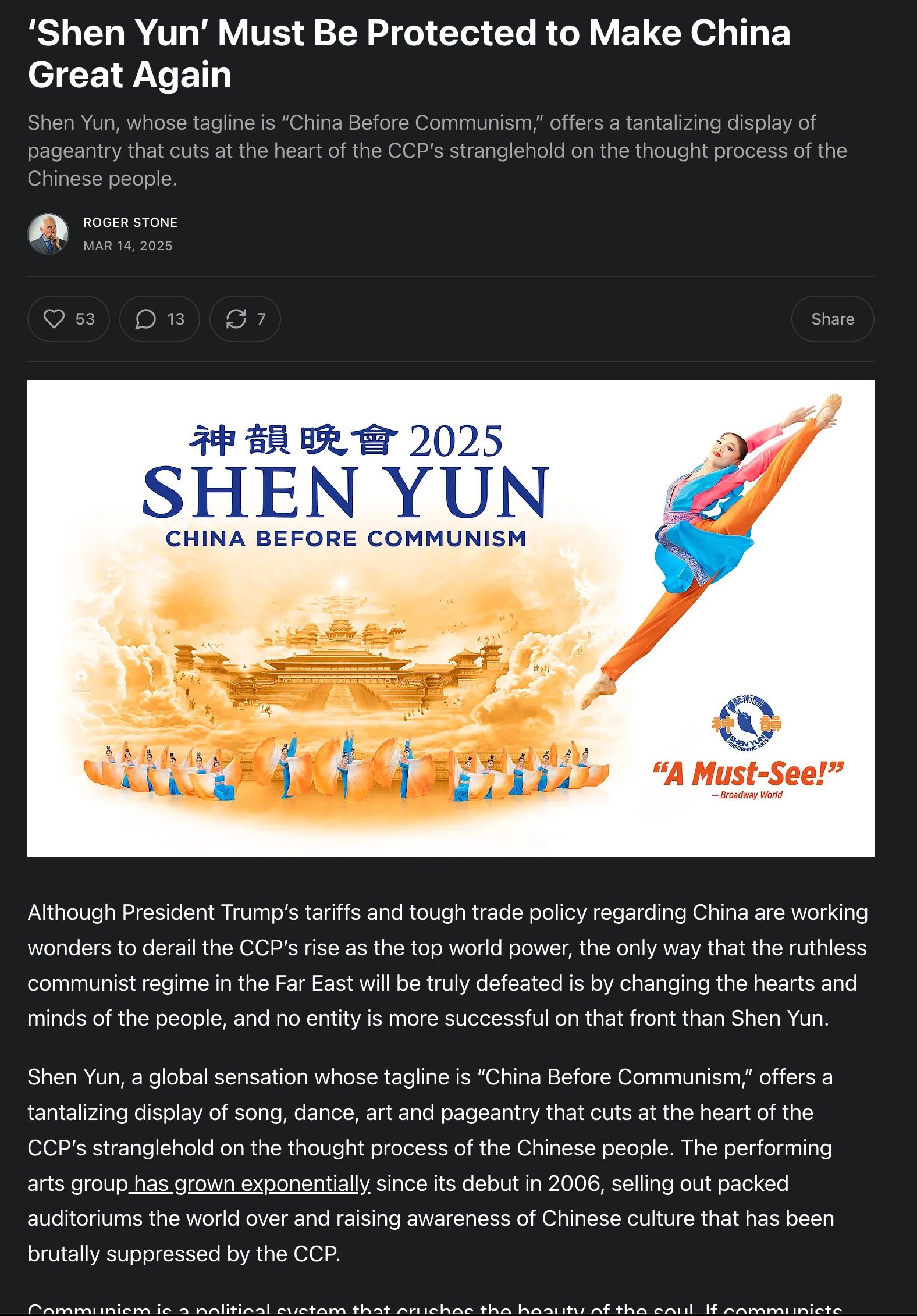 著名美國政治顧問、作家,美國政壇傳奇人物、川普總統的摯友羅傑.斯通(Roger Stone) 3月14日在他的X平台「Stone Cold Truth with Roger Stone」上發佈了一篇題為《必須保護『神韻』,讓中國再次偉大》的文章談論如何擊敗中共。他指出,「真正打敗遠東殘酷共產主義政權的唯一方法是改變人民的思想和心靈,在這方面沒有哪個機構比神韻更成功。」他並提議:「將神韻帶到白宮進行演出,將是美國嘲笑中共鎮壓的一個聰明方式。」