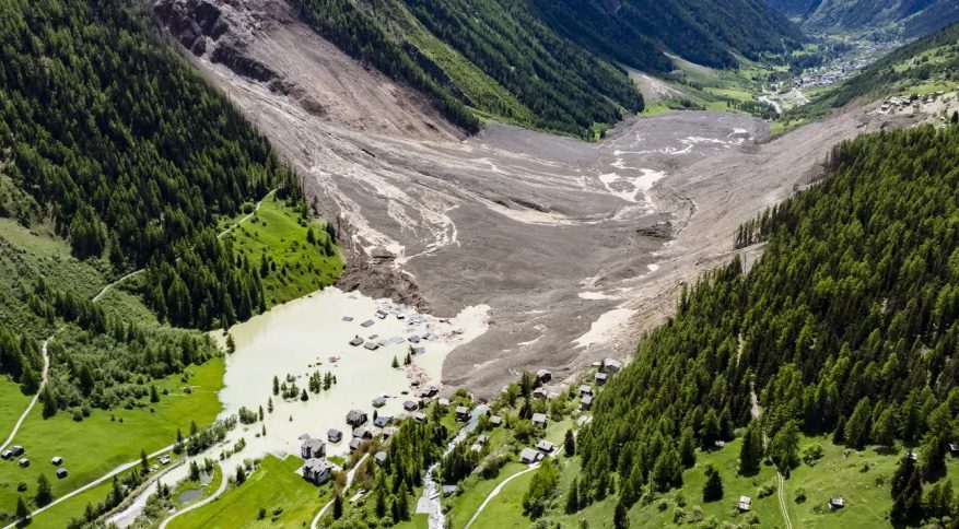 據瑞士資訊網報導, 周三(5月28日)下午, 阿爾卑斯山南部洛奇山谷(Lötschental valley)的伯希冰川(Birch Glacier)上約300萬立方米的岩石和永凍土坍塌,淹沒了洛奇山谷底的布拉藤村整個村莊,該村莊居民的房屋、教堂和墓地都被掩埋在厚達50-200米的瓦礫之下,整個村莊從地圖上消失了,只留下村邊的一些屋頂若隱若現。