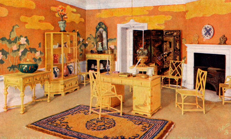 玩具屋的頂層是王后的客廳,這件作品中表現出的濃郁中國風可以看出當時歐洲上層社會對中國飾物的喜愛。中國畫風的壁畫,搭配上客廳中來自中國的屏風、明式椅子、牆上的彩繪瓷器以及桌子上的玉制擺件一起構成了一個極具中國特色的會客廳。
