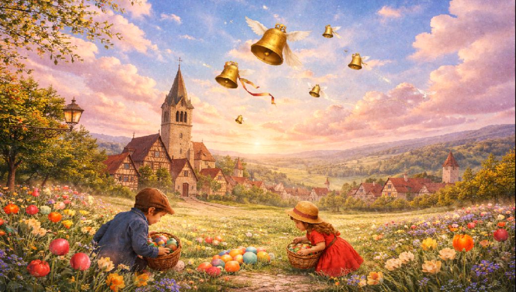 而玩興正濃的孩子們似乎早已不再關心鐘聲,仍舊低頭在花園裡尋找着彩蛋。至於那些鍾究竟是不是真的飛去過羅馬——在復活節的早晨,這個問題似乎已經不那麼重要了。
