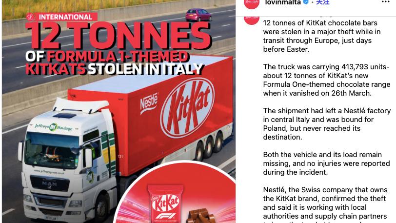 KitKat星期天(29日)透過聲明證實,一輛運送該公司41萬3793條新系列巧克力的貨車在歐洲運送途中遭竊,這批貨物重約12公噸,上周從生產地運往配送地途中消失。